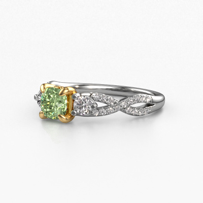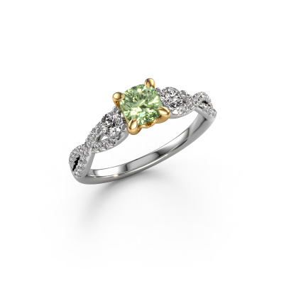 The ring shown above is called the Marilou CUS. We call this type of ring a 3-stone ring because it has one centre gemstone and a band that is also pave set with gemstones. The 14 Carat white gold engagement ring is set with a cushion 5 mm green lab grown diamond centre stone and the band is pave set with diamond gemstones. Each jewel is unique in every way! Simply customize to your liking,This traditional white gold 3-stone engagement ring has an exquisite cushion green lab grown diamond centre stone. To further accentuate the centre stone, the band is fully set with more diamonds. Its open prong setting allows light to strike the green lab grown diamond from various angles and this adds sparkle to your green lab grown diamond ring. The photo shown above depicts the goldsmith's carefully handcrafted details of the ring. The high positioning of the centre stone is truly eye-catching. The perfect engagement ring for the crown jewel of your life! By using a combination of the latest modern techniques, combined with ancient crafting, we can make all our engagement rings in our own studio. Each jewel is made to order. This is advantageous because we can offer you a price you won't find anywhere else.Our team adds new designs to our online collection daily. Our designers and goldsmiths work together in creating the best design. We strive to offer a diverse collection of jewels. Perhaps you have a specific jewel design in mind. One you came across somewhere. Please contact us for a free consultation. We will make you an offer, based on a fair price/ quality ratio, that will baffle you.To make it easier for you, we offer a 30 day return policy. Check our terms and conditions.