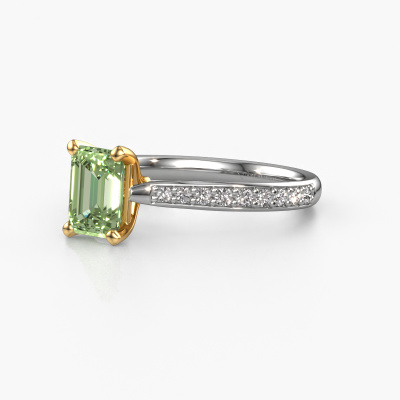 The ring shown above is called the Mignon eme 2. We call this type of ring a pavé solitaire ring because it has one centre gemstone and a band that is also pave set with gemstones. The 14 Carat white gold engagement ring is set with a emerald cut 7x5 mm green lab grown diamond centre stone and the band is pave set with lab grown diamond gemstones. Each jewel is made just for you, with attention to detail and design.This exclusive white gold pavé solitaire engagement ring has an exquisite emerald cut green lab grown diamond centre stone. To further accentuate the centre stone, the band is fully set with more lab-grown diamonds. Its open prong setting allows light to strike the green lab grown diamond from various angles and this adds sparkle to your green lab grown diamond ring. The photo shown above depicts the goldsmith's carefully handcrafted details of the ring. The high positioning of the centre stone is truly eye-catching. The perfect engagement ring for the crown jewel of your life! Are you on a budget? Please feel free to contact us, so we can go discuss your options. We offer our engagement rings at guaranteed best price, because we make them to order. You won't find such a price anywhere else!Do you have a specific ring in mind? One you came across somewhere. Please feel free to tell us your wishes and we will turn your design into a unique engagement ring. You can follow the development of your ring design because we use 3D drawings. This gives you a realistic preview of your design. We will gladly send you a non-binding offer, based on a fair price/ quality ratio. It will amaze you.To make it easier for you, we offer a 30 day return policy. Check our terms and conditions.
