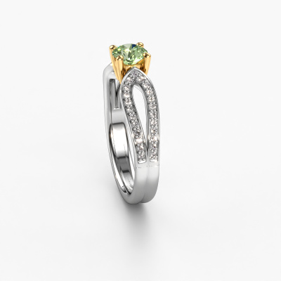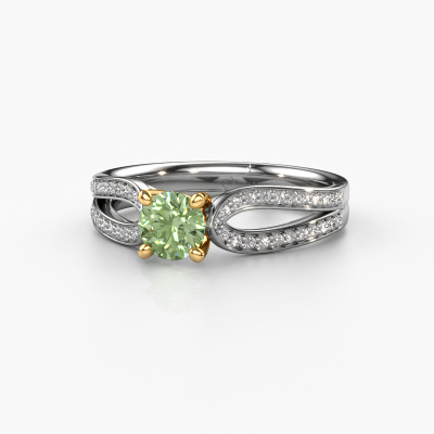 The ring shown above is called the Antonia rnd 2. We call this type of ring a pavé solitaire ring because it has one centre gemstone and a band that is also pave set with gemstones. The 14 Carat white gold engagement ring is set with a round 5 mm green lab grown diamond centre stone and the band is pave set with diamond gemstones. Each jewel is made just for you, with attention to detail and design.This traditional white gold pavé solitaire engagement ring has an exquisite round green lab grown diamond centre stone. To further accentuate the centre stone, the band is fully set with more diamonds. Its open prong setting allows light to strike the green lab grown diamond from various angles and this adds sparkle to your green lab grown diamond ring. The photo shown above depicts the goldsmith's carefully handcrafted details of the ring. The high positioning of the centre stone is truly eye-catching. The perfect engagement ring for the crown jewel of your life! After receiving your order, our goldsmiths will start the creative process of making your Antonia rnd 2 engagement ring. We don't keep stock. This is advantageous because these costs will not be passed on to you. Therefore, we can offer jewellery at exceptionally low prices.Have you found a specific engagement ring somewhere which you would like to give to your loved one? Please feel free to express your wishes to our jewel designers because we would be honoured to turn your design into a traditional engagement ring. You can follow the development of your ring design because we use 3D drawings. This gives you a realistic preview of how your design will look. You can also preorder a dummy. A dummy is a plastic ring, which can be shaped according your ring design. You can try it on and check if its width and size are suitable for you. We will gladly send you a non-binding offer, based on a fair price/ quality ratio. It will amaze you, considering the quality of the ring and gemstones.To make it easier for you, we offer a 30 day return policy. Check our terms and conditions.
