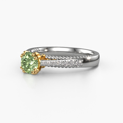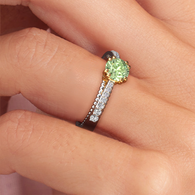 The ring shown above is called the Rozella. We call this type of ring a pavé solitaire ring because it has one centre gemstone and a band that is also pave set with gemstones. The 14 Carat white gold engagement ring is set with a round 5.5 mm green lab grown diamond centre stone and the band is pave set with lab grown diamond gemstones. Each jewel is made to shine bright around your finger. Each jewel is hand made with love by our goldsmiths.This unique white gold pavé solitaire engagement ring has an exquisite round green lab grown diamond centre stone. To further accentuate the centre stone, the band is fully set with more lab-grown diamonds. Its open prong setting allows light to strike the green lab grown diamond from various angles and this adds sparkle to your green lab grown diamond ring. The photo shown above depicts the goldsmith's carefully handcrafted details of the ring. The high positioning of the centre stone is truly eye-catching. The perfect engagement ring for the crown jewel of your life! After receiving your order, our goldsmiths will start the creative process of making your Rozella engagement ring. We don't keep stock. This is advantageous because these costs will not be passed on to you. Therefore, we can offer jewellery at exceptionally low prices.Our designers and goldsmiths work together each day, creating new jewels. Perhaps you have found a nice unique engagement ring somewhere, which can be used to customize your unique ring. Please feel free to contact us. We will make you an offer, based on a fair price/ quality ratio, which will amaze you.To make it easier for you, we offer a 30 day return policy. Check our terms and conditions.