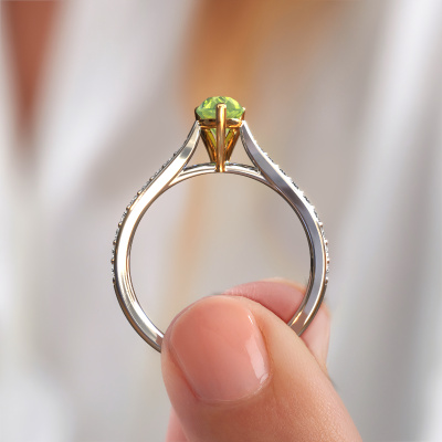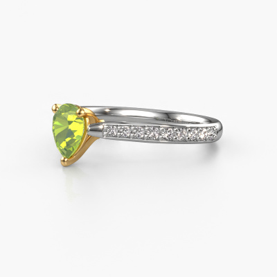 The ring shown above is called the Mignon per 2. We call this type of ring a pavé solitaire ring because it has one centre gemstone and a band that is also pave set with gemstones. The 14 Carat white gold engagement ring is set with a pear 6.5x4.5 mm peridot centre stone and the band is pave set with diamond gemstones. Each jewel is made just for you by our master goldsmiths in our own studio.This trendy white gold pavé solitaire engagement ring has an exquisite pear peridot centre stone. To further accentuate the centre stone, the band is fully set with more diamonds. Its open prong setting allows light to strike the peridot from various angles and this adds sparkle to your peridot ring. The photo shown above depicts the goldsmith's carefully handcrafted details of the ring. The high positioning of the centre stone is truly eye-catching. The perfect engagement ring for the crown jewel of your life! Are you on a budget? Please feel free to contact us, so we can go discuss your options. We offer our engagement rings at guaranteed best price, because we make them to order. You won't find such a price anywhere else!Our team adds new designs to our online collection daily. Our designers and goldsmiths work together in creating the best design. We strive to offer a diverse collection of jewels. Perhaps you have a specific jewel design in mind. One you came across somewhere. Please contact us for a free consultation. We will make you an offer, based on a fair price/ quality ratio, that will baffle you.To make it easier for you, we offer a 30 day return policy. Check our terms and conditions.