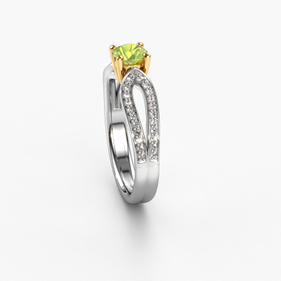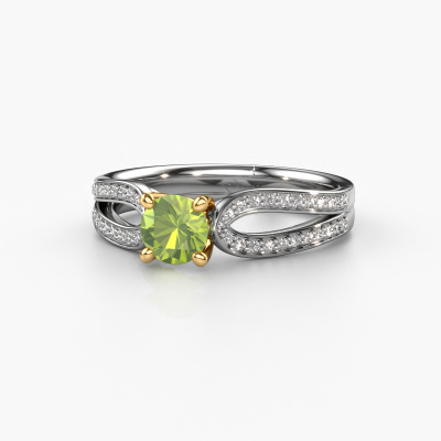 The ring shown above is called the Antonia rnd 2. We call this type of ring a pavé solitaire ring because it has one centre gemstone and a band that is also pave set with gemstones. The 14 Carat white gold engagement ring is set with a round 5 mm peridot centre stone and the band is pave set with diamond gemstones. Each jewel is made just for you, with attention to detail and design.This traditional white gold pavé solitaire engagement ring has an exquisite round peridot centre stone. To further accentuate the centre stone, the band is fully set with more diamonds. Its open prong setting allows light to strike the peridot from various angles and this adds sparkle to your peridot ring. The photo shown above depicts the goldsmith's carefully handcrafted details of the ring. The high positioning of the centre stone is truly eye-catching. The perfect engagement ring for the crown jewel of your life! After receiving your order, our goldsmiths will start the creative process of making your Antonia rnd 2 engagement ring. We don't keep stock. This is advantageous because these costs will not be passed on to you. Therefore, we can offer jewellery at exceptionally low prices.Have you found a specific engagement ring somewhere which you would like to give to your loved one? Please feel free to express your wishes to our jewel designers because we would be honoured to turn your design into a traditional engagement ring. You can follow the development of your ring design because we use 3D drawings. This gives you a realistic preview of how your design will look. You can also preorder a dummy. A dummy is a plastic ring, which can be shaped according your ring design. You can try it on and check if its width and size are suitable for you. We will gladly send you a non-binding offer, based on a fair price/ quality ratio. It will amaze you, considering the quality of the ring and gemstones.To make it easier for you, we offer a 30 day return policy. Check our terms and conditions.