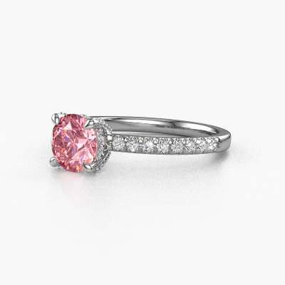 The ring shown above is called the Saskia rnd 1. We call this type of ring a pavé solitaire ring because it has one centre gemstone and a band that is also pave set with gemstones. The 14 Carat white gold engagement ring is set with a round 6.5 mm pink lab grown diamond centre stone and the band is pave set with lab grown diamond gemstones. Each jewel is made with passion and love by one of our master goldsmiths.This exclusive white gold pavé solitaire engagement ring has an exquisite round pink lab grown diamond centre stone. To further accentuate the centre stone, the band is fully set with more lab-grown diamonds. Its open prong setting allows light to strike the pink lab grown diamond from various angles and this adds sparkle to your pink lab grown diamond ring. The photo shown above depicts the goldsmith's carefully handcrafted details of the ring. The high positioning of the centre stone is truly eye-catching. The perfect engagement ring for the crown jewel of your life! By using a combination of the latest modern techniques, combined with ancient crafting, we can make all our engagement rings in our own studio. Each jewel is made to order. This is advantageous because we can offer you a price you won't find anywhere else.Do you have a specific ring in mind? One you came across somewhere. Please feel free to tell us your wishes and we will turn your design into a unique engagement ring. You can follow the development of your ring design because we use 3D drawings. This gives you a realistic preview of your design. We will gladly send you a non-binding offer, based on a fair price/ quality ratio. It will amaze you.To make it easier for you, we offer a 30 day return policy. Check our terms and conditions.