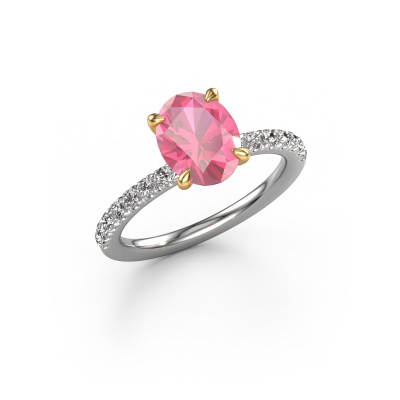 The ring shown above is called the Crystal OVL 2. We call this type of ring a pavé solitaire ring because it has one centre gemstone and a band that is also pave set with gemstones. The 14 Carat white gold engagement ring is set with a oval 9x7 mm pink sapphire centre stone and the band is pave set with lab grown diamond gemstones. Each jewel is made just for you by our master goldsmiths in our own studio.This exclusive white gold pavé solitaire engagement ring has an exquisite oval pink sapphire centre stone. To further accentuate the centre stone, the band is fully set with more lab-grown diamonds. Its open prong setting allows light to strike the pink sapphire from various angles and this adds sparkle to your pink sapphire ring. The photo shown above depicts the goldsmith's carefully handcrafted details of the ring. The high positioning of the centre stone is truly eye-catching. The perfect engagement ring for the crown jewel of your life! By using a combination of the latest modern techniques, combined with ancient crafting, we can make all our engagement rings in our own studio. Each jewel is made to order. This is advantageous because we can offer you a price you won't find anywhere else.Our team adds new designs to our online collection daily. Our designers and goldsmiths work together in creating the best design. We strive to offer a diverse collection of jewels. Perhaps you have a specific jewel design in mind. One you came across somewhere. Please contact us for a free consultation. We will make you an offer, based on a fair price/ quality ratio, that will baffle you.To make it easier for you, we offer a 30 day return policy. Check our terms and conditions.