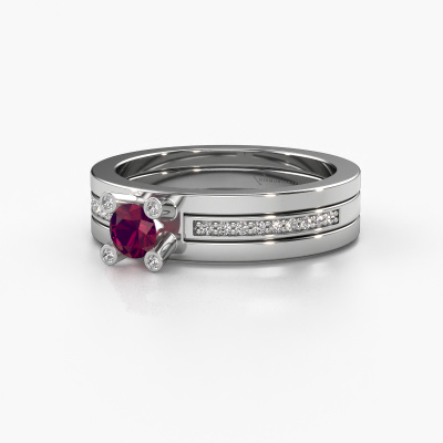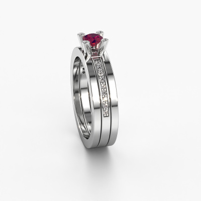 The ring shown above is called the Alisha. We call this type of ring a pavé solitaire ring because it has one centre gemstone and a band that is also pave set with gemstones. The 14 Carat white gold engagement ring is set with a round 4 mm rhodolite centre stone and the band is pave set with diamond gemstones. Each jewel is unique in every way! Simply customize to your liking,This design white gold pavé solitaire engagement ring has an exquisite round rhodolite centre stone. To further accentuate the centre stone, the band is fully set with more diamonds. Its open prong setting allows light to strike the rhodolite from various angles and this adds sparkle to your rhodolite ring. The photo shown above depicts the goldsmith's carefully handcrafted details of the ring. The high positioning of the centre stone is truly eye-catching. The perfect engagement ring for the crown jewel of your life! By using a combination of the latest modern techniques, combined with ancient crafting, we can make all our engagement rings in our own studio. Each jewel is made to order. This is advantageous because we can offer you a price you won't find anywhere else.Have you found a specific engagement ring somewhere which you would like to give to your loved one? Please feel free to express your wishes to our jewel designers because we would be honoured to turn your design into a design engagement ring. You can follow the development of your ring design because we use 3D drawings. This gives you a realistic preview of how your design will look. You can also preorder a dummy. A dummy is a plastic ring, which can be shaped according your ring design. You can try it on and check if its width and size are suitable for you. We will gladly send you a non-binding offer, based on a fair price/ quality ratio. It will amaze you, considering the quality of the ring and gemstones.To make it easier for you, we offer a 30 day return policy. Check our terms and conditions.