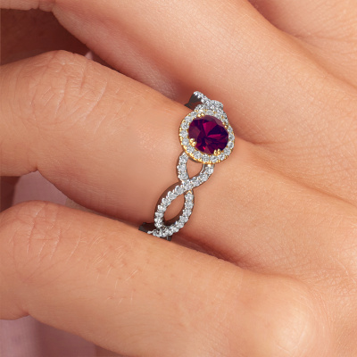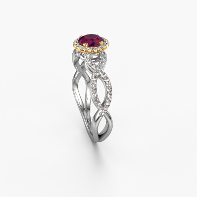 The ring shown above is called the Dionne rnd. We call this type of ring a pavé solitaire ring because it has one centre gemstone and a band that is also pave set with gemstones. The 14 Carat white gold engagement ring is set with a round 5 mm rhodolite centre stone and the band is pave set with diamond gemstones. Each jewel is made just for you by our master goldsmiths in our own studio.This classic white gold pavé solitaire engagement ring has an exquisite round rhodolite centre stone. To further accentuate the centre stone, the band is fully set with more diamonds. Its open prong setting allows light to strike the rhodolite from various angles and this adds sparkle to your rhodolite ring. The photo shown above depicts the goldsmith's carefully handcrafted details of the ring. The high positioning of the centre stone is truly eye-catching. The perfect engagement ring for the crown jewel of your life! Because we design and deliver our own rings, we can offer you a engagement ring at a price you won't find anywhere else. A ring is made to order, which helps prevent excess supplies, so we can make you a great price offer. We understand it feels risky, buying your engagement ring online, but we will gladly assist in the designing process, taking your budget into consideration.Do you have a specific ring in mind? One you came across somewhere. Please feel free to tell us your wishes and we will turn your design into a unique engagement ring. You can follow the development of your ring design because we use 3D drawings. This gives you a realistic preview of your design. We will gladly send you a non-binding offer, based on a fair price/ quality ratio. It will amaze you.To make it easier for you, we offer a 30 day return policy. Check our terms and conditions.
