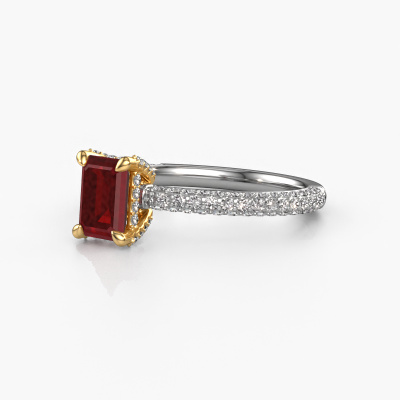 The ring shown above is called the Saskia eme 2. We call this type of ring a pavé solitaire ring because it has one centre gemstone and a band that is also pave set with gemstones. The 14 Carat white gold engagement ring is set with a emerald cut 6.5x4.5 mm ruby centre stone and the band is pave set with diamond gemstones. Each jewel is made by a team of passionate goldsmiths and jewel designers. This will make your crown jewel truly eye-catching.This exclusive white gold pavé solitaire engagement ring has an exquisite emerald cut ruby centre stone. To further accentuate the centre stone, the band is fully set with more diamonds. Its open prong setting allows light to strike the ruby from various angles and this adds sparkle to your ruby ring. The photo shown above depicts the goldsmith's carefully handcrafted details of the ring. The high positioning of the centre stone is truly eye-catching. The perfect engagement ring for the crown jewel of your life! By using our modern techniques, we can design and customize the finest quality jewels with the utmost care for you. Our engagement rings are always priced 30 percent lower than other jewellers. We make engagement rings to order so we don't have to maintain a large stock. If you have a certain budget, we are more than happy to advice you accordingly.Different styles of new rings are made daily by our team. Perhaps you have found a pavé solitaire engagement ring somewhere. One you would like to give to your loved one. Please feel free to share your thoughts and design with our jewel designers. We would love to turn your design into a exclusive engagement ring. You can follow the development of your ring design because we use very detailed 3D drawings. On top of that, you can order a dummy of the design. A dummy is a plastic ring, which can be shaped according your ring design. You can try it on and check if the engagement ring is up to standard. We will gladly send you a non-binding offer, based on a fair price/ quality ratio. The offer will baffle you, considering the quality of the ring and gemstones.To make it easier for you, we offer a 30 day return policy. Check our terms and conditions.