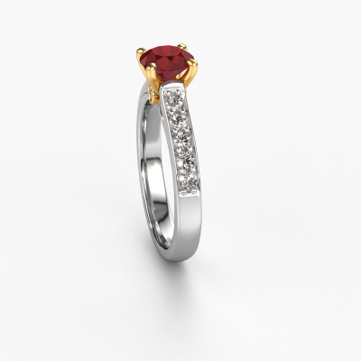 The ring shown above is called the Valorie RND 2. We call this type of ring a pavé solitaire ring because it has one centre gemstone and a band that is also pave set with gemstones. The 14 Carat white gold engagement ring is set with a round 6.5 mm ruby centre stone and the band is pave set with lab grown diamond gemstones. Each jewel is made just for you, with attention to detail and design.This modern white gold pavé solitaire engagement ring has an exquisite round ruby centre stone. To further accentuate the centre stone, the band is fully set with more lab-grown diamonds. Its open prong setting allows light to strike the ruby from various angles and this adds sparkle to your ruby ring. The photo shown above depicts the goldsmith's carefully handcrafted details of the ring. The high positioning of the centre stone is truly eye-catching. The perfect engagement ring for the crown jewel of your life! By using our modern techniques, we can design and customize the finest quality jewels with the utmost care for you. Our engagement rings are always priced 30 percent lower than other jewellers. We make engagement rings to order so we don't have to maintain a large stock. If you have a certain budget, we are more than happy to advice you accordingly.Our designers and goldsmiths work together each day, creating new jewels. Perhaps you have found a nice modern engagement ring somewhere, which can be used to customize your unique ring. Please feel free to contact us. We will make you an offer, based on a fair price/ quality ratio, which will amaze you.To make it easier for you, we offer a 30 day return policy. Check our terms and conditions.