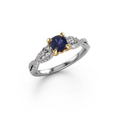 The ring shown above is called the Marilou CUS. We call this type of ring a 3-stone ring because it has one centre gemstone and a band that is also pave set with gemstones. The 14 Carat white gold engagement ring is set with a cushion 5 mm sapphire centre stone and the band is pave set with diamond gemstones. Each jewel is unique in every way! Simply customize to your liking,This traditional white gold 3-stone engagement ring has an exquisite cushion sapphire centre stone. To further accentuate the centre stone, the band is fully set with more diamonds. Its open prong setting allows light to strike the sapphire from various angles and this adds sparkle to your sapphire ring. The photo shown above depicts the goldsmith's carefully handcrafted details of the ring. The high positioning of the centre stone is truly eye-catching. The perfect engagement ring for the crown jewel of your life! By using a combination of the latest modern techniques, combined with ancient crafting, we can make all our engagement rings in our own studio. Each jewel is made to order. This is advantageous because we can offer you a price you won't find anywhere else.Our team adds new designs to our online collection daily. Our designers and goldsmiths work together in creating the best design. We strive to offer a diverse collection of jewels. Perhaps you have a specific jewel design in mind. One you came across somewhere. Please contact us for a free consultation. We will make you an offer, based on a fair price/ quality ratio, that will baffle you.To make it easier for you, we offer a 30 day return policy. Check our terms and conditions.