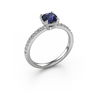 The ring shown above is called the Saskia 1 cus. We call this type of ring a pavé solitaire ring because it has one centre gemstone and a band that is also pave set with gemstones. The 14 Carat white gold engagement ring is set with a cushion 5.5 mm sapphire centre stone and the band is pave set with diamond gemstones. Each jewel is made by a team of passionate goldsmiths and jewel designers. This will make your crown jewel truly eye-catching.This unique white gold pavé solitaire engagement ring has an exquisite cushion sapphire centre stone. To further accentuate the centre stone, the band is fully set with more diamonds. Its open prong setting allows light to strike the sapphire from various angles and this adds sparkle to your sapphire ring. The photo shown above depicts the goldsmith's carefully handcrafted details of the ring. The high positioning of the centre stone is truly eye-catching. The perfect engagement ring for the crown jewel of your life! By using a combination of the latest modern techniques, combined with ancient crafting, we can make all our engagement rings in our own studio. Each jewel is made to order. This is advantageous because we can offer you a price you won't find anywhere else.Our team adds new designs to our online collection daily. Our designers and goldsmiths work together in creating the best design. We strive to offer a diverse collection of jewels. Perhaps you have a specific jewel design in mind. One you came across somewhere. Please contact us for a free consultation. We will make you an offer, based on a fair price/ quality ratio, that will baffle you.To make it easier for you, we offer a 30 day return policy. Check our terms and conditions.