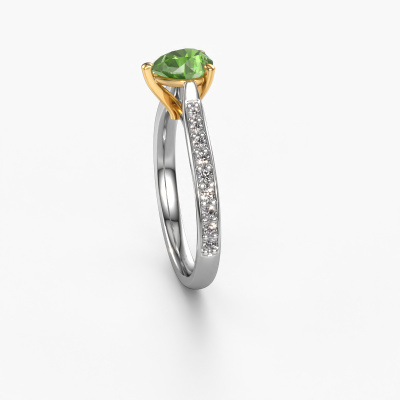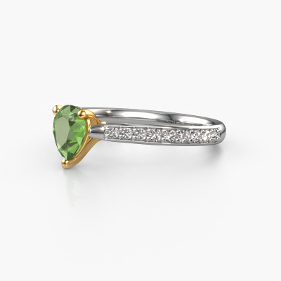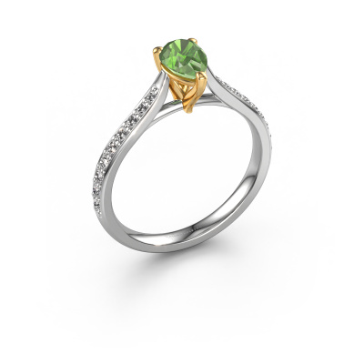 The ring shown above is called the Mignon per 2. We call this type of ring a pavé solitaire ring because it has one centre gemstone and a band that is also pave set with gemstones. The 14 Carat white gold engagement ring is set with a pear 6.5x4.5 mm tourmaline green centre stone and the band is pave set with diamond gemstones. Each jewel is made just for you by our master goldsmiths in our own studio.This trendy white gold pavé solitaire engagement ring has an exquisite pear tourmaline green centre stone. To further accentuate the centre stone, the band is fully set with more diamonds. Its open prong setting allows light to strike the tourmaline green from various angles and this adds sparkle to your tourmaline green ring. The photo shown above depicts the goldsmith's carefully handcrafted details of the ring. The high positioning of the centre stone is truly eye-catching. The perfect engagement ring for the crown jewel of your life! Are you on a budget? Please feel free to contact us, so we can go discuss your options. We offer our engagement rings at guaranteed best price, because we make them to order. You won't find such a price anywhere else!Our team adds new designs to our online collection daily. Our designers and goldsmiths work together in creating the best design. We strive to offer a diverse collection of jewels. Perhaps you have a specific jewel design in mind. One you came across somewhere. Please contact us for a free consultation. We will make you an offer, based on a fair price/ quality ratio, that will baffle you.To make it easier for you, we offer a 30 day return policy. Check our terms and conditions.
