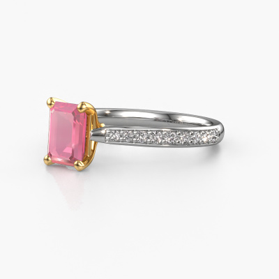 The ring shown above is called the Mignon eme 2. We call this type of ring a pavé solitaire ring because it has one centre gemstone and a band that is also pave set with gemstones. The 14 Carat white gold engagement ring is set with a emerald cut 7x5 mm tourmaline pink centre stone and the band is pave set with lab grown diamond gemstones. Each jewel is made just for you, with attention to detail and design.This exclusive white gold pavé solitaire engagement ring has an exquisite emerald cut tourmaline pink centre stone. To further accentuate the centre stone, the band is fully set with more lab-grown diamonds. Its open prong setting allows light to strike the tourmaline pink from various angles and this adds sparkle to your tourmaline pink ring. The photo shown above depicts the goldsmith's carefully handcrafted details of the ring. The high positioning of the centre stone is truly eye-catching. The perfect engagement ring for the crown jewel of your life! Are you on a budget? Please feel free to contact us, so we can go discuss your options. We offer our engagement rings at guaranteed best price, because we make them to order. You won't find such a price anywhere else!Do you have a specific ring in mind? One you came across somewhere. Please feel free to tell us your wishes and we will turn your design into a unique engagement ring. You can follow the development of your ring design because we use 3D drawings. This gives you a realistic preview of your design. We will gladly send you a non-binding offer, based on a fair price/ quality ratio. It will amaze you.To make it easier for you, we offer a 30 day return policy. Check our terms and conditions.