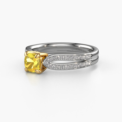 The ring shown above is called the Antonia cus 2. We call this type of ring a pavé solitaire ring because it has one centre gemstone and a band that is also pave set with gemstones. The 14 Carat white gold engagement ring is set with a cushion 5 mm yellow sapphire centre stone and the band is pave set with lab grown diamond gemstones. Each jewel is made just for you by our master goldsmiths in our own studio.This fantasy white gold pavé solitaire engagement ring has an exquisite cushion yellow sapphire centre stone. To further accentuate the centre stone, the band is fully set with more lab-grown diamonds. Its open prong setting allows light to strike the yellow sapphire from various angles and this adds sparkle to your yellow sapphire ring. The photo shown above depicts the goldsmith's carefully handcrafted details of the ring. The high positioning of the centre stone is truly eye-catching. The perfect engagement ring for the crown jewel of your life! By using our modern techniques, we can design and customize the finest quality jewels with the utmost care for you. Our engagement rings are always priced 30 percent lower than other jewellers. We make engagement rings to order so we don't have to maintain a large stock. If you have a certain budget, we are more than happy to advice you accordingly.Have you found a specific engagement ring somewhere which you would like to give to your loved one? Please feel free to express your wishes to our jewel designers because we would be honoured to turn your design into a fantasy engagement ring. You can follow the development of your ring design because we use 3D drawings. This gives you a realistic preview of how your design will look. You can also preorder a dummy. A dummy is a plastic ring, which can be shaped according your ring design. You can try it on and check if its width and size are suitable for you. We will gladly send you a non-binding offer, based on a fair price/ quality ratio. It will amaze you, considering the quality of the ring and gemstones.To make it easier for you, we offer a 30 day return policy. Check our terms and conditions.