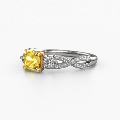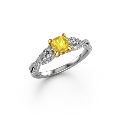 The ring shown above is called the Marilou CUS. We call this type of ring a 3-stone ring because it has one centre gemstone and a band that is also pave set with gemstones. The 14 Carat white gold engagement ring is set with a cushion 5 mm yellow sapphire centre stone and the band is pave set with diamond gemstones. Each jewel is unique in every way! Simply customize to your liking,This traditional white gold 3-stone engagement ring has an exquisite cushion yellow sapphire centre stone. To further accentuate the centre stone, the band is fully set with more diamonds. Its open prong setting allows light to strike the yellow sapphire from various angles and this adds sparkle to your yellow sapphire ring. The photo shown above depicts the goldsmith's carefully handcrafted details of the ring. The high positioning of the centre stone is truly eye-catching. The perfect engagement ring for the crown jewel of your life! By using a combination of the latest modern techniques, combined with ancient crafting, we can make all our engagement rings in our own studio. Each jewel is made to order. This is advantageous because we can offer you a price you won't find anywhere else.Our team adds new designs to our online collection daily. Our designers and goldsmiths work together in creating the best design. We strive to offer a diverse collection of jewels. Perhaps you have a specific jewel design in mind. One you came across somewhere. Please contact us for a free consultation. We will make you an offer, based on a fair price/ quality ratio, that will baffle you.To make it easier for you, we offer a 30 day return policy. Check our terms and conditions.