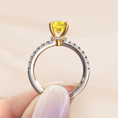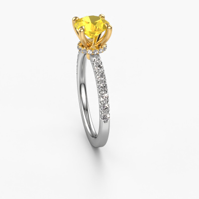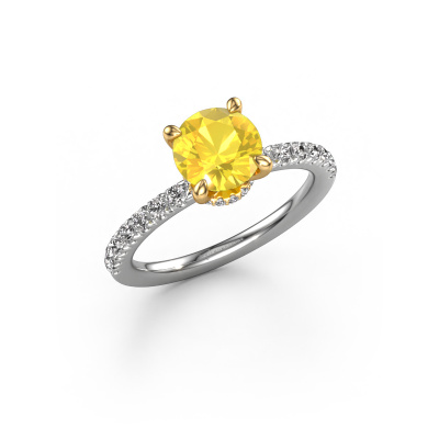 The ring shown above is called the Crystal rnd 4. We call this type of ring a pavé solitaire ring because it has one centre gemstone and a band that is also pave set with gemstones. The 14 Carat white gold engagement ring is set with a round 7 mm yellow sapphire centre stone and the band is pave set with lab grown diamond gemstones. Each jewel is made to shine bright around your finger. Each jewel is hand made with love by our goldsmiths.This fantasy white gold pavé solitaire engagement ring has an exquisite round yellow sapphire centre stone. To further accentuate the centre stone, the band is fully set with more lab-grown diamonds. Its open prong setting allows light to strike the yellow sapphire from various angles and this adds sparkle to your yellow sapphire ring. The photo shown above depicts the goldsmith's carefully handcrafted details of the ring. The high positioning of the centre stone is truly eye-catching. The perfect engagement ring for the crown jewel of your life! By using our modern techniques, we can design and customize the finest quality jewels with the utmost care for you. Our engagement rings are always priced 30 percent lower than other jewellers. We make engagement rings to order so we don't have to maintain a large stock. If you have a certain budget, we are more than happy to advice you accordingly.Have you found a specific engagement ring somewhere which you would like to give to your loved one? Please feel free to express your wishes to our jewel designers because we would be honoured to turn your design into a fantasy engagement ring. You can follow the development of your ring design because we use 3D drawings. This gives you a realistic preview of how your design will look. You can also preorder a dummy. A dummy is a plastic ring, which can be shaped according your ring design. You can try it on and check if its width and size are suitable for you. We will gladly send you a non-binding offer, based on a fair price/ quality ratio. It will amaze you, considering the quality of the ring and gemstones.To make it easier for you, we offer a 30 day return policy. Check our terms and conditions.