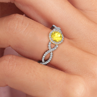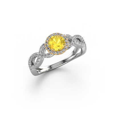 The ring shown above is called the Dionne rnd. We call this type of ring a pavé solitaire ring because it has one centre gemstone and a band that is also pave set with gemstones. The 14 Carat white gold engagement ring is set with a round 5 mm yellow sapphire centre stone and the band is pave set with diamond gemstones. Each jewel is made just for you by our master goldsmiths in our own studio.This classic white gold pavé solitaire engagement ring has an exquisite round yellow sapphire centre stone. To further accentuate the centre stone, the band is fully set with more diamonds. Its open prong setting allows light to strike the yellow sapphire from various angles and this adds sparkle to your yellow sapphire ring. The photo shown above depicts the goldsmith's carefully handcrafted details of the ring. The high positioning of the centre stone is truly eye-catching. The perfect engagement ring for the crown jewel of your life! Because we design and deliver our own rings, we can offer you a engagement ring at a price you won't find anywhere else. A ring is made to order, which helps prevent excess supplies, so we can make you a great price offer. We understand it feels risky, buying your engagement ring online, but we will gladly assist in the designing process, taking your budget into consideration.Do you have a specific ring in mind? One you came across somewhere. Please feel free to tell us your wishes and we will turn your design into a unique engagement ring. You can follow the development of your ring design because we use 3D drawings. This gives you a realistic preview of your design. We will gladly send you a non-binding offer, based on a fair price/ quality ratio. It will amaze you.To make it easier for you, we offer a 30 day return policy. Check our terms and conditions.