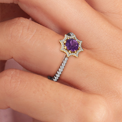 This 14 Carat white gold ring is called Zena and is set with amethyst. An extraordinary white gold vintage ring. One that will surely make the love of your life shine like a diamond! That is what we hope to achieve. This fantasy engagement ring is