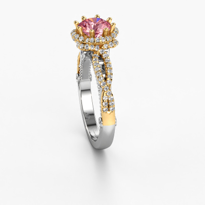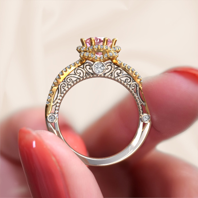 This 14 Carat white gold ring is called Lysanne and is set with 6.5 mm pink lab grown diamond. This filigree white gold engagement ring is a true work of art! A beautifully adorned design of intricate wires. With dedication, patience and the utmost precision, our expert goldsmith will design a ring just for you. The adornment of small wiring is crafted to perfection by hand. It's a lengthy process which includes welding, crafting and polishing until our Goldsmiths are completely satisfied with the result: a perfect eye-catching ring that makes her shine with delight. Therefore the vintage filigree engagement ring is an extraordinary gift to bestow upon the love of your life. A handmade one-of-a-kind personalized ring, to be given to that special someone on that special moment when you pop the question. Isn't that wonderful? This piece of jewellery is made by a team of passionate goldsmiths and jewel designers. This will make your crown jewel truly eye-catching.After receiving your order, our goldsmiths will start the creative process of making your Lysanne engagement ring. We don't keep stock. This is advantageous because these costs will not be passed on to you. Therefore, we can offer jewellery at exceptionally low prices.Have you found a specific engagement ring somewhere which you would like to give to your loved one? Please feel free to express your wishes to our jewel designers because we would be honoured to turn your design into a vintage engagement ring. You can follow the development of your ring design because we use 3D drawings. This gives you a realistic preview of how your design will look. You can also preorder a dummy. A dummy is a plastic ring, which can be shaped according your ring design. You can try it on and check if its width and size are suitable for you. We will gladly send you a non-binding offer, based on a fair price/ quality ratio. It will amaze you, considering the quality of the ring and gemstones.To make it easier for you, we offer a 30 day return policy. Check our terms and conditions.
