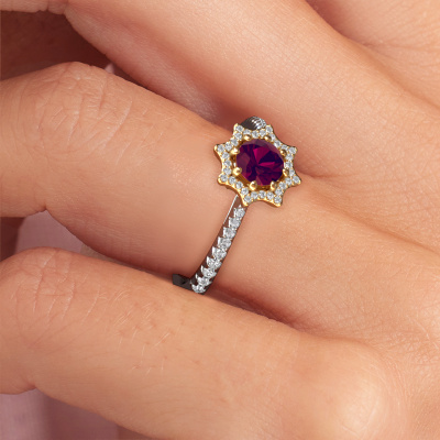 This 14 Carat white gold ring is called Zena and is set with rhodolite. An extraordinary white gold vintage ring. One that will surely make the love of your life shine like a diamond! That is what we hope to achieve. This fantasy engagement ring is