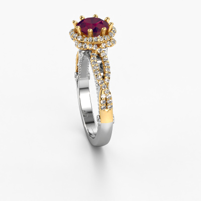 This 14 Carat white gold ring is called Lysanne and is set with 6.5 mm rhodolite. This filigree white gold engagement ring is a true work of art! A beautifully adorned design of intricate wires. With dedication, patience and the utmost precision, our expert goldsmith will design a ring just for you. The adornment of small wiring is crafted to perfection by hand. It's a lengthy process which includes welding, crafting and polishing until our Goldsmiths are completely satisfied with the result: a perfect eye-catching ring that makes her shine with delight. Therefore the vintage filigree engagement ring is an extraordinary gift to bestow upon the love of your life. A handmade one-of-a-kind personalized ring, to be given to that special someone on that special moment when you pop the question. Isn't that wonderful? This piece of jewellery is made by a team of passionate goldsmiths and jewel designers. This will make your crown jewel truly eye-catching.After receiving your order, our goldsmiths will start the creative process of making your Lysanne engagement ring. We don't keep stock. This is advantageous because these costs will not be passed on to you. Therefore, we can offer jewellery at exceptionally low prices.Have you found a specific engagement ring somewhere which you would like to give to your loved one? Please feel free to express your wishes to our jewel designers because we would be honoured to turn your design into a vintage engagement ring. You can follow the development of your ring design because we use 3D drawings. This gives you a realistic preview of how your design will look. You can also preorder a dummy. A dummy is a plastic ring, which can be shaped according your ring design. You can try it on and check if its width and size are suitable for you. We will gladly send you a non-binding offer, based on a fair price/ quality ratio. It will amaze you, considering the quality of the ring and gemstones.To make it easier for you, we offer a 30 day return policy. Check our terms and conditions.