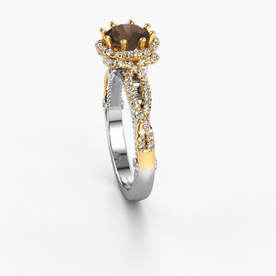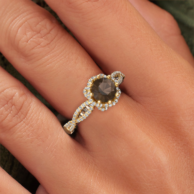 This 14 Carat white gold ring is called Lysanne and is set with 6.5 mm smokey quartz. This filigree white gold engagement ring is a true work of art! A beautifully adorned design of intricate wires. With dedication, patience and the utmost precision, our expert goldsmith will design a ring just for you. The adornment of small wiring is crafted to perfection by hand. It's a lengthy process which includes welding, crafting and polishing until our Goldsmiths are completely satisfied with the result: a perfect eye-catching ring that makes her shine with delight. Therefore the vintage filigree engagement ring is an extraordinary gift to bestow upon the love of your life. A handmade one-of-a-kind personalized ring, to be given to that special someone on that special moment when you pop the question. Isn't that wonderful? This piece of jewellery is made by a team of passionate goldsmiths and jewel designers. This will make your crown jewel truly eye-catching.After receiving your order, our goldsmiths will start the creative process of making your Lysanne engagement ring. We don't keep stock. This is advantageous because these costs will not be passed on to you. Therefore, we can offer jewellery at exceptionally low prices.Have you found a specific engagement ring somewhere which you would like to give to your loved one? Please feel free to express your wishes to our jewel designers because we would be honoured to turn your design into a vintage engagement ring. You can follow the development of your ring design because we use 3D drawings. This gives you a realistic preview of how your design will look. You can also preorder a dummy. A dummy is a plastic ring, which can be shaped according your ring design. You can try it on and check if its width and size are suitable for you. We will gladly send you a non-binding offer, based on a fair price/ quality ratio. It will amaze you, considering the quality of the ring and gemstones.To make it easier for you, we offer a 30 day return policy. Check our terms and conditions.