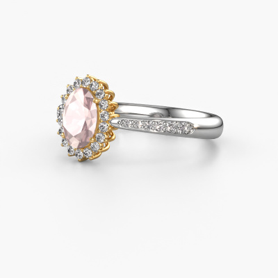 The ring shown above is called the Tilly ovl 2. We call this type of ring a cluster ring, the centre gemstone is surrounded by smaller sized stones. This 14 Carat white gold version is set with a 7x5 mm oval morganite champagne centre stone, embraced by smaller lab-grown diamonds. If you look at this white gold cluster engagement ring, you might get the impression that its smaller sized stones collide with the bigger morganite champagne, so it is shaped like a flower. Therefore this engagement ring is also known as the flower ring. Our artisan goldsmiths get the job done. Each individual stone is carefully set by hand. During manufacturing, light fall is constantly monitored to make sure the special cluster effect is still visible. In the end you get the perfect engagement ring with a radiant morganite champagne gemstone centrepiece. You can imagine the effect of a ring of such significance when you give tot the love of your life on her special day to shine. By using our modern techniques, we can design and customize the finest quality jewels with the utmost care for you. Our engagement rings are always priced 30 percent lower than other jewellers. We make engagement rings to order so we don't have to maintain a large stock. If you have a certain budget, we are more than happy to advice you accordingly.Different styles of new rings are made daily by our team. Perhaps you have found a cluster engagement ring somewhere. One you would like to give to your loved one. Please feel free to share your thoughts and design with our jewel designers. We would love to turn your design into a classic engagement ring. You can follow the development of your ring design because we use very detailed 3D drawings. On top of that, you can order a dummy of the design. A dummy is a plastic ring, which can be shaped according your ring design. You can try it on and check if the engagement ring is up to standard. We will gladly send you a non-binding offer, based on a fair price/ quality ratio. The offer will baffle you, considering the quality of the ring and gemstones.To make it easier for you, we offer a 30 day return policy. Check our terms and conditions.
