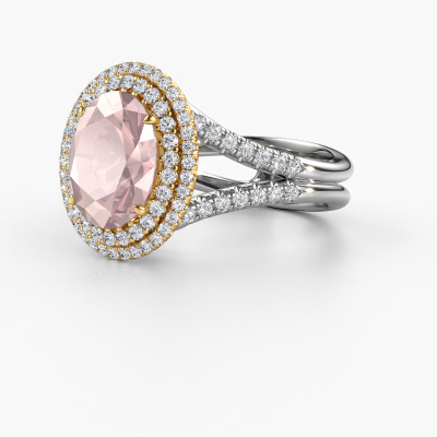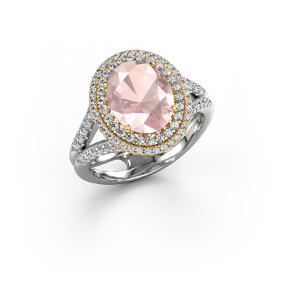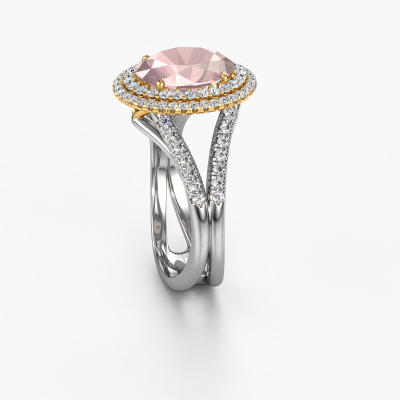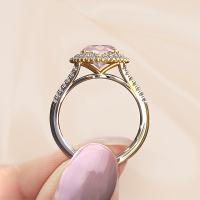 The ring shown above is called the Elvie. We call this type of ring a halo ring because it has one centre gemstone and a band that is also pave set with gemstones. The 14 Carat white gold engagement ring is set with a oval 10x8 mm morganite champagne centre stone and the band is pave set with lab-grown diamonds. What makes this vintage white gold pavé solitaire ring special are the smaller sized stones embracing the centre stone. This gorgeous engagement ring is called a pavé solitaire ring because the smaller gemstones give the centre stone a pavé solitaire of surrounding light. In order for the smaller stones to enhance the centre stone, they have to be placed so there is no interference of light. And that's when our expert goldsmiths come in. Each individual stone is carefully set in the ring by hand. During manufacturing, light fall is constantly monitored to make sure the special pavé solitaire is still visible. In the end you get a unique engagement ring, with a morganite champagne of your choosing at its centre. You can imagine the effect of a ring of such significance when you give it to her on her special day to shine. By using our modern techniques, we can design and customize the finest quality jewels with the utmost care for you. Our engagement rings are always priced 30 percent lower than other jewellers. We make engagement rings to order so we don't have to maintain a large stock. If you have a certain budget, we are more than happy to advice you accordingly.Do you have a specific ring in mind? One you came across somewhere. Please feel free to tell us your wishes and we will turn your design into a unique engagement ring. You can follow the development of your ring design because we use 3D drawings. This gives you a realistic preview of your design. We will gladly send you a non-binding offer, based on a fair price/ quality ratio. It will amaze you.To make it easier for you, we offer a 30 day return policy. Check our terms and conditions.