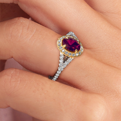 The ring shown above is called the Pamela OVL. We call this type of ring a halo ring because it has one centre gemstone and a band that is also pave set with gemstones. The 14 Carat white gold engagement ring is set with a oval 7x5 mm rhodolite centre stone and the band is pave set with lab-grown diamonds. What makes this luxury white gold halo ring special are the smaller sized stones embracing the centre stone. This gorgeous engagement ring is called a halo ring because the smaller gemstones give the centre stone a halo of surrounding light. In order for the smaller stones to enhance the centre stone, they have to be placed so there is no interference of light. And that's when our expert goldsmiths come in. Each individual stone is carefully set in the ring by hand. During manufacturing, light fall is constantly monitored to make sure the special halo is still visible. In the end you get a unique engagement ring, with a rhodolite of your choosing at its centre. You can imagine the effect of a ring of such significance when you give it to her on her special day to shine. By using our modern techniques, we can design and customize the finest quality jewels with the utmost care for you. Our engagement rings are always priced 30 percent lower than other jewellers. We make engagement rings to order so we don't have to maintain a large stock. If you have a certain budget, we are more than happy to advice you accordingly.Our team adds new designs to our online collection daily. Our designers and goldsmiths work together in creating the best design. We strive to offer a diverse collection of jewels. Perhaps you have a specific jewel design in mind. One you came across somewhere. Please contact us for a free consultation. We will make you an offer, based on a fair price/ quality ratio, that will baffle you.To make it easier for you, we offer a 30 day return policy. Check our terms and conditions.