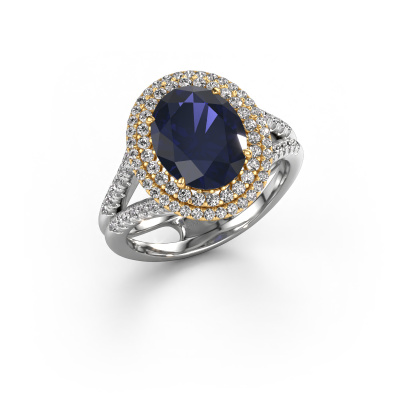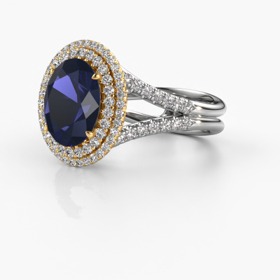 The ring shown above is called the Elvie. We call this type of ring a halo ring because it has one centre gemstone and a band that is also pave set with gemstones. The 14 Carat white gold engagement ring is set with a oval 10x8 mm sapphire centre stone and the band is pave set with lab-grown diamonds. What makes this vintage white gold pavé solitaire ring special are the smaller sized stones embracing the centre stone. This gorgeous engagement ring is called a pavé solitaire ring because the smaller gemstones give the centre stone a pavé solitaire of surrounding light. In order for the smaller stones to enhance the centre stone, they have to be placed so there is no interference of light. And that's when our expert goldsmiths come in. Each individual stone is carefully set in the ring by hand. During manufacturing, light fall is constantly monitored to make sure the special pavé solitaire is still visible. In the end you get a unique engagement ring, with a sapphire of your choosing at its centre. You can imagine the effect of a ring of such significance when you give it to her on her special day to shine. By using our modern techniques, we can design and customize the finest quality jewels with the utmost care for you. Our engagement rings are always priced 30 percent lower than other jewellers. We make engagement rings to order so we don't have to maintain a large stock. If you have a certain budget, we are more than happy to advice you accordingly.Do you have a specific ring in mind? One you came across somewhere. Please feel free to tell us your wishes and we will turn your design into a unique engagement ring. You can follow the development of your ring design because we use 3D drawings. This gives you a realistic preview of your design. We will gladly send you a non-binding offer, based on a fair price/ quality ratio. It will amaze you.To make it easier for you, we offer a 30 day return policy. Check our terms and conditions.