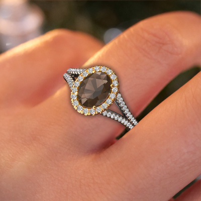 This 14 Carat white gold ring is called Verla ovl 2 and is set with 8x6 mm smokey quartz. Does your girlfriend fancy exclusive jewellery? Or would you like to show her that she deserves the finest jewellery? This white gold ring is pure craftsmanship, love and passion combined with the latest techniques coming together in perfect harmony. It requires a keen eye, patience and a skilful hand to mould this ring into perfection. Just the job for our expert goldsmith! The smokey quartz set gemstones gives this white gold ring an extra glamorous appearance. Customize the style of the split band engagement ring to her liking with a wide variety of precious metals and gemstones which you select. That is how you create a unique ring for the most exclusive woman in your life! This jewel is made by a team of passionate goldsmiths and jewel designers. This will make your crown jewel truly eye-catching.By using our modern techniques, we can design and customize the finest quality jewels with the utmost care for you. Our engagement rings are always priced 30 percent lower than other jewellers. We make engagement rings to order so we don't have to maintain a large stock. If you have a certain budget, we are more than happy to advice you accordingly.Our team adds new designs to our online collection daily. Our designers and goldsmiths work together in creating the best design. We strive to offer a diverse collection of jewels. Perhaps you have a specific jewel design in mind. One you came across somewhere. Please contact us for a free consultation. We will make you an offer, based on a fair price/ quality ratio, that will baffle you.To make it easier for you, we offer a 30 day return policy. Check our terms and conditions.