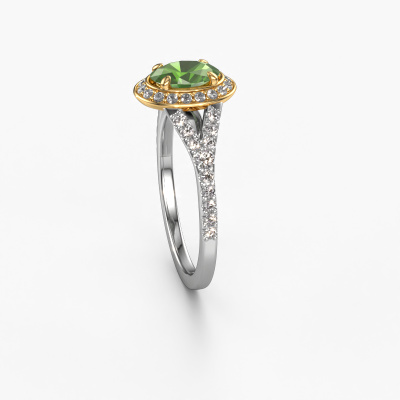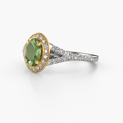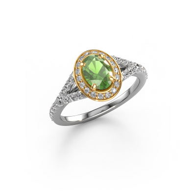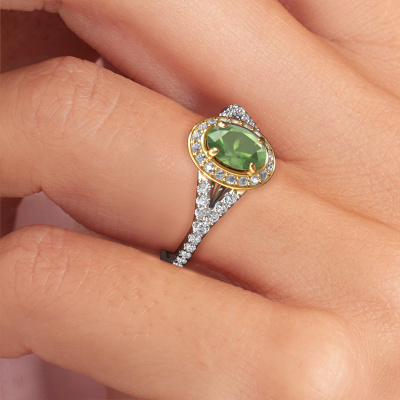 The ring shown above is called the Pamela OVL. We call this type of ring a halo ring because it has one centre gemstone and a band that is also pave set with gemstones. The 14 Carat white gold engagement ring is set with a oval 7x5 mm tourmaline green centre stone and the band is pave set with lab-grown diamonds. What makes this luxury white gold halo ring special are the smaller sized stones embracing the centre stone. This gorgeous engagement ring is called a halo ring because the smaller gemstones give the centre stone a halo of surrounding light. In order for the smaller stones to enhance the centre stone, they have to be placed so there is no interference of light. And that's when our expert goldsmiths come in. Each individual stone is carefully set in the ring by hand. During manufacturing, light fall is constantly monitored to make sure the special halo is still visible. In the end you get a unique engagement ring, with a tourmaline green of your choosing at its centre. You can imagine the effect of a ring of such significance when you give it to her on her special day to shine. By using our modern techniques, we can design and customize the finest quality jewels with the utmost care for you. Our engagement rings are always priced 30 percent lower than other jewellers. We make engagement rings to order so we don't have to maintain a large stock. If you have a certain budget, we are more than happy to advice you accordingly.Our team adds new designs to our online collection daily. Our designers and goldsmiths work together in creating the best design. We strive to offer a diverse collection of jewels. Perhaps you have a specific jewel design in mind. One you came across somewhere. Please contact us for a free consultation. We will make you an offer, based on a fair price/ quality ratio, that will baffle you.To make it easier for you, we offer a 30 day return policy. Check our terms and conditions.
