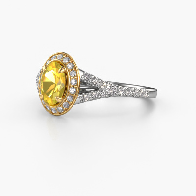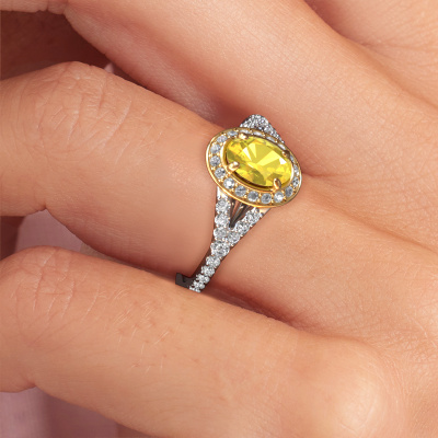 The ring shown above is called the Pamela OVL. We call this type of ring a halo ring because it has one centre gemstone and a band that is also pave set with gemstones. The 14 Carat white gold engagement ring is set with a oval 7x5 mm yellow sapphire centre stone and the band is pave set with lab-grown diamonds. What makes this luxury white gold halo ring special are the smaller sized stones embracing the centre stone. This gorgeous engagement ring is called a halo ring because the smaller gemstones give the centre stone a halo of surrounding light. In order for the smaller stones to enhance the centre stone, they have to be placed so there is no interference of light. And that's when our expert goldsmiths come in. Each individual stone is carefully set in the ring by hand. During manufacturing, light fall is constantly monitored to make sure the special halo is still visible. In the end you get a unique engagement ring, with a yellow sapphire of your choosing at its centre. You can imagine the effect of a ring of such significance when you give it to her on her special day to shine. By using our modern techniques, we can design and customize the finest quality jewels with the utmost care for you. Our engagement rings are always priced 30 percent lower than other jewellers. We make engagement rings to order so we don't have to maintain a large stock. If you have a certain budget, we are more than happy to advice you accordingly.Our team adds new designs to our online collection daily. Our designers and goldsmiths work together in creating the best design. We strive to offer a diverse collection of jewels. Perhaps you have a specific jewel design in mind. One you came across somewhere. Please contact us for a free consultation. We will make you an offer, based on a fair price/ quality ratio, that will baffle you.To make it easier for you, we offer a 30 day return policy. Check our terms and conditions.
