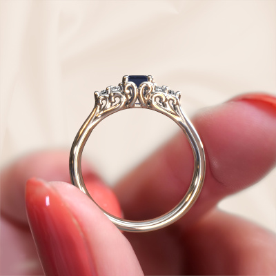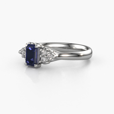 This 14 Carat white gold ring is called Myrna EME and is set with 6x4 mm sapphire. This filigree white gold engagement ring is a true work of art! A beautifully adorned design of intricate wires. With dedication, patience and the utmost precision, our expert goldsmith will design a ring just for you. The adornment of small wiring is crafted to perfection by hand. It's a lengthy process which includes welding, crafting and polishing until our Goldsmiths are completely satisfied with the result: a perfect eye-catching ring that makes her shine with delight. Therefore the vintage filigree engagement ring is an extraordinary gift to bestow upon the love of your life. A handmade one-of-a-kind personalized ring, to be given to that special someone on that special moment when you pop the question. Isn't that wonderful? This piece of jewellery is unique in every way! Simply customize to your likingBy using our modern techniques, we can design and customize the finest quality jewels with the utmost care for you. Our engagement rings are always priced 30 percent lower than other jewellers. We make engagement rings to order so we don't have to maintain a large stock. If you have a certain budget, we are more than happy to advice you accordingly.Have you found a specific engagement ring somewhere which you would like to give to your loved one? Please feel free to express your wishes to our jewel designers because we would be honoured to turn your design into a vintage engagement ring. You can follow the development of your ring design because we use 3D drawings. This gives you a realistic preview of how your design will look. You can also preorder a dummy. A dummy is a plastic ring, which can be shaped according your ring design. You can try it on and check if its width and size are suitable for you. We will gladly send you a non-binding offer, based on a fair price/ quality ratio. It will amaze you, considering the quality of the ring and gemstones.To make it easier for you, we offer a 30 day return policy. Check our terms and conditions.