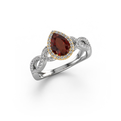 This 14 Carat white gold ring is called Dionne pear and is set with 7x5 mm garnet. Does your girlfriend fancy exclusive jewellery? Or would you like to show her that she deserves the finest jewellery? This white gold ring is pure craftsmanship, love and passion combined with the latest techniques coming together in perfect harmony. It requires a keen eye, patience and a skilful hand to mould this ring into perfection. Just the job for our expert goldsmith! The garnet set gemstones gives this white gold ring an extra glamorous appearance. Customize the style of the twist engagement ring to her liking with a wide variety of precious metals and gemstones which you select. That is how you create a unique ring for the most exclusive woman in your life! This jewel is created to add sparkle to your finger, each jewel is lovingly made by hand by our goldsmiths.Are you on a budget? Please feel free to contact us, so we can go discuss your options. We offer our engagement rings at guaranteed best price, because we make them to order. You won't find such a price anywhere else!Different styles of new rings are made daily by our team. Perhaps you have found a pavé solitaire engagement ring somewhere. One you would like to give to your loved one. Please feel free to share your thoughts and design with our jewel designers. We would love to turn your design into a exclusive engagement ring. You can follow the development of your ring design because we use very detailed 3D drawings. On top of that, you can order a dummy of the design. A dummy is a plastic ring, which can be shaped according your ring design. You can try it on and check if the engagement ring is up to standard. We will gladly send you a non-binding offer, based on a fair price/ quality ratio. The offer will baffle you, considering the quality of the ring and gemstones.To make it easier for you, we offer a 30 day return policy. Check our terms and conditions.