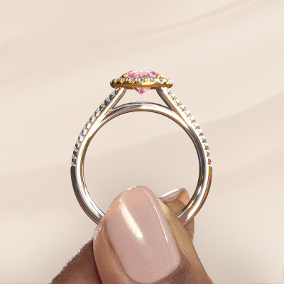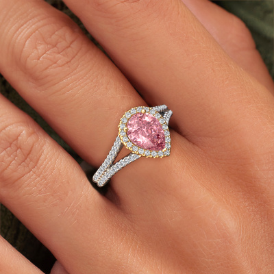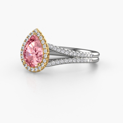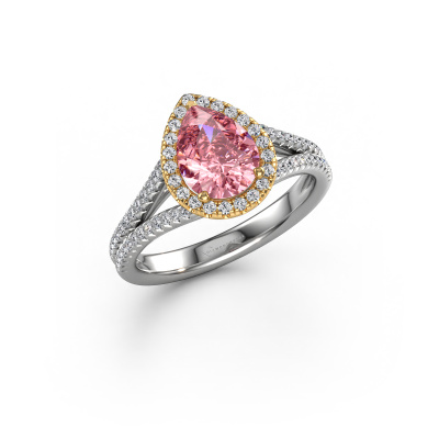 The ring shown above is called the Verla pear 2. We call this type of ring a halo ring because it has one centre gemstone and a band that is also pave set with gemstones. The 14 Carat white gold engagement ring is set with a pear 8x6 mm pink lab grown diamond centre stone and the band is pave set with diamonds. What makes this exclusive white gold halo ring special are the smaller sized stones embracing the centre stone. This gorgeous engagement ring is called a halo ring because the smaller gemstones give the centre stone a halo of surrounding light. In order for the smaller stones to enhance the centre stone, they have to be placed so there is no interference of light. And that's when our expert goldsmiths come in. Each individual stone is carefully set in the ring by hand. During manufacturing, light fall is constantly monitored to make sure the special halo is still visible. In the end you get a unique engagement ring, with a pink lab grown diamond of your choosing at its centre. You can imagine the effect of a ring of such significance when you give it to her on her special day to shine. After receiving your order, our goldsmiths will passionately start the creative process of making your engagement ring in our own studio. Because we don't have a big stockpile, these costs will not be passed on to you. Our pricing is proof of that! We offer top quality jewels at lowest price, guaranteed.Our designers and goldsmiths work together each day, creating new jewels. Perhaps you have found a nice exclusive engagement ring somewhere, which can be used to customize your unique ring. Please feel free to contact us. We will make you an offer, based on a fair price/ quality ratio, which will amaze you.To make it easier for you, we offer a 30 day return policy. Check our terms and conditions.