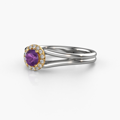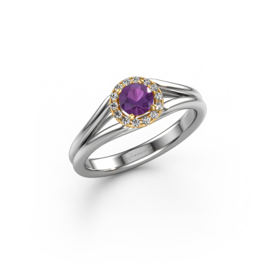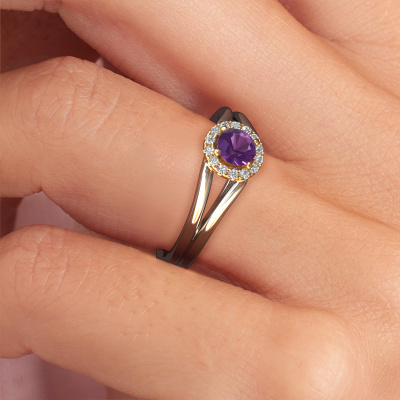The ring shown above is called the Verla rnd 1. We call this type of ring a halo ring because it has one centre gemstone and a band that is also pave set with gemstones. The 14 Carat white gold engagement ring is set with a round 4.7 mm amethyst centre stone and the band is pave set with diamonds. What makes this classic white gold halo ring special are the smaller sized stones embracing the centre stone. This gorgeous engagement ring is called a halo ring because the smaller gemstones give the centre stone a halo of surrounding light. In order for the smaller stones to enhance the centre stone, they have to be placed so there is no interference of light. And that's when our expert goldsmiths come in. Each individual stone is carefully set in the ring by hand. During manufacturing, light fall is constantly monitored to make sure the special halo is still visible. In the end you get a unique engagement ring, with a amethyst of your choosing at its centre. You can imagine the effect of a ring of such significance when you give it to her on her special day to shine. By using a combination of the latest modern techniques, combined with ancient crafting, we can make all our engagement rings in our own studio. Each jewel is made to order. This is advantageous because we can offer you a price you won't find anywhere else.Our team adds new designs to our online collection daily. Our designers and goldsmiths work together in creating the best design. We strive to offer a diverse collection of jewels. Perhaps you have a specific jewel design in mind. One you came across somewhere. Please contact us for a free consultation. We will make you an offer, based on a fair price/ quality ratio, that will baffle you.To make it easier for you, we offer a 30 day return policy. Check our terms and conditions.