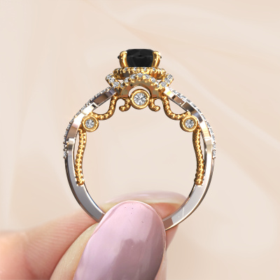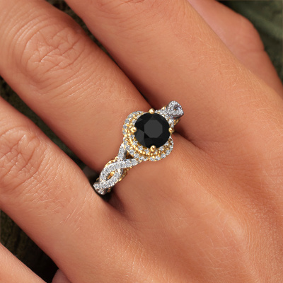 The ring shown above is called the Leora. We call this type of ring a halo ring because it has one centre gemstone and a band that is also pave set with gemstones. The 14 Carat white gold engagement ring is set with a round 1.30 crt black diamond centre stone and the band is pave set with lab-grown diamonds. What makes this vintage white gold halo ring special are the smaller sized stones embracing the centre stone. This gorgeous engagement ring is called a halo ring because the smaller gemstones give the centre stone a halo of surrounding light. In order for the smaller stones to enhance the centre stone, they have to be placed so there is no interference of light. And that's when our expert goldsmiths come in. Each individual stone is carefully set in the ring by hand. During manufacturing, light fall is constantly monitored to make sure the special halo is still visible. In the end you get a unique engagement ring, with a black diamond of your choosing at its centre. You can imagine the effect of a ring of such significance when you give it to her on her special day to shine. By using our modern techniques, we can design and customize the finest quality jewels with the utmost care for you. Our engagement rings are always priced 30 percent lower than other jewellers. We make engagement rings to order so we don't have to maintain a large stock. If you have a certain budget, we are more than happy to advice you accordingly.Our designers and goldsmiths work together each day, creating new jewels. Perhaps you have found a nice vintage engagement ring somewhere, which can be used to customize your unique ring. Please feel free to contact us. We will make you an offer, based on a fair price/ quality ratio, which will amaze you.To make it easier for you, we offer a 30 day return policy. Check our terms and conditions.