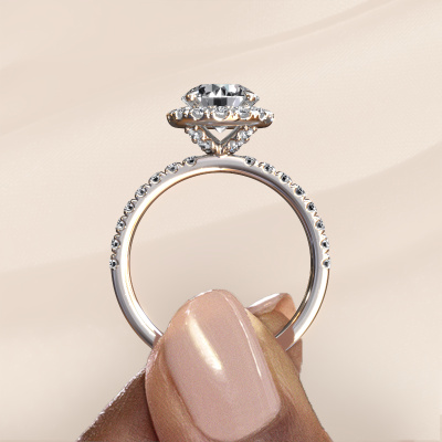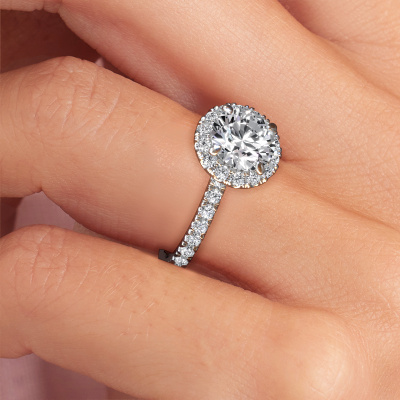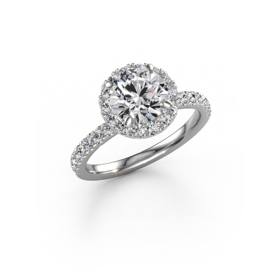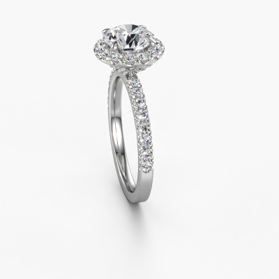 The ring shown above is called the Miranda RND. We call this type of ring a halo ring because it has one centre gemstone and a band that is also pave set with gemstones. The 14 Carat white gold engagement ring is set with a round 1.50 crt diamond centre stone and the band is pave set with lab-grown diamonds. What makes this exclusive white gold halo ring special are the smaller sized stones embracing the centre stone. This gorgeous engagement ring is called a halo ring because the smaller gemstones give the centre stone a halo of surrounding light. In order for the smaller stones to enhance the centre stone, they have to be placed so there is no interference of light. And that's when our expert goldsmiths come in. Each individual stone is carefully set in the ring by hand. During manufacturing, light fall is constantly monitored to make sure the special halo is still visible. In the end you get a unique engagement ring, with a diamond of your choosing at its centre. You can imagine the effect of a ring of such significance when you give it to her on her special day to shine. By using our modern techniques, we can design and customize the finest quality jewels with the utmost care for you. Our engagement rings are always priced 30 percent lower than other jewellers. We make engagement rings to order so we don't have to maintain a large stock. If you have a certain budget, we are more than happy to advice you accordingly.Have you found a specific engagement ring somewhere which you would like to give to your loved one? Please feel free to express your wishes to our jewel designers because we would be honoured to turn your design into a exclusive engagement ring. You can follow the development of your ring design because we use 3D drawings. This gives you a realistic preview of how your design will look. You can also preorder a dummy. A dummy is a plastic ring, which can be shaped according your ring design. You can try it on and check if its width and size are suitable for you. We will gladly send you a non-binding offer, based on a fair price/ quality ratio. It will amaze you, considering the quality of the ring and gemstones.To make it easier for you, we offer a 30 day return policy. Check our terms and conditions.
