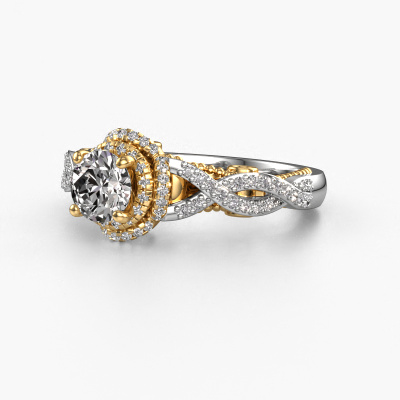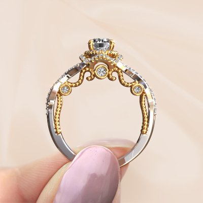 The ring shown above is called the Leora. We call this type of ring a halo ring because it has one centre gemstone and a band that is also pave set with gemstones. The 14 Carat white gold engagement ring is set with a round 0.60 crt diamond centre stone and the band is pave set with lab-grown diamonds. What makes this vintage white gold halo ring special are the smaller sized stones embracing the centre stone. This gorgeous engagement ring is called a halo ring because the smaller gemstones give the centre stone a halo of surrounding light. In order for the smaller stones to enhance the centre stone, they have to be placed so there is no interference of light. And that's when our expert goldsmiths come in. Each individual stone is carefully set in the ring by hand. During manufacturing, light fall is constantly monitored to make sure the special halo is still visible. In the end you get a unique engagement ring, with a diamond of your choosing at its centre. You can imagine the effect of a ring of such significance when you give it to her on her special day to shine. By using our modern techniques, we can design and customize the finest quality jewels with the utmost care for you. Our engagement rings are always priced 30 percent lower than other jewellers. We make engagement rings to order so we don't have to maintain a large stock. If you have a certain budget, we are more than happy to advice you accordingly.Our designers and goldsmiths work together each day, creating new jewels. Perhaps you have found a nice vintage engagement ring somewhere, which can be used to customize your unique ring. Please feel free to contact us. We will make you an offer, based on a fair price/ quality ratio, which will amaze you.To make it easier for you, we offer a 30 day return policy. Check our terms and conditions.