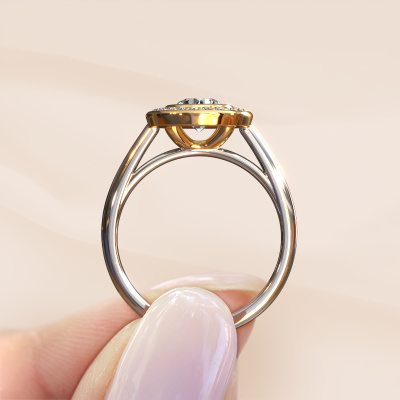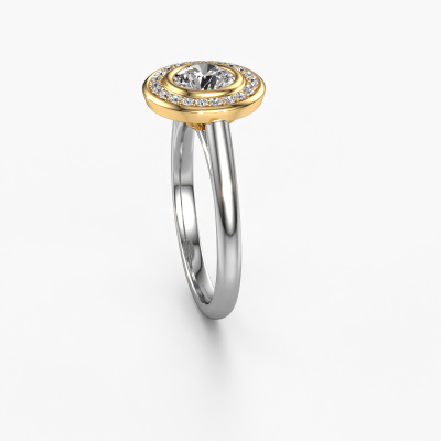 The ring shown above is called the Noud 1 RND. We call this type of ring a halo ring because it has one centre gemstone and a band that is also pave set with gemstones. The 14 Carat white gold promise ring is set with a round 0.60 crt diamond centre stone and the band is pave set with diamonds. What makes this traditional white gold halo ring special are the smaller sized stones embracing the centre stone. This gorgeous promise ring is called a halo ring because the smaller gemstones give the centre stone a halo of surrounding light. In order for the smaller stones to enhance the centre stone, they have to be placed so there is no interference of light. And that's when our expert goldsmiths come in. Each individual stone is carefully set in the ring by hand. During manufacturing, light fall is constantly monitored to make sure the special halo is still visible. In the end you get a unique promise ring, with a diamond of your choosing at its centre. You can imagine the effect of a ring of such significance when you give it to her on her special day to shine. By using a combination of the latest modern techniques, combined with ancient crafting, we can make all our promise ring in our own studio. Each jewel is made to order. This is advantageous because we can offer you a price you won't find anywhere else.Do you have a specific ring in mind? One you came across somewhere. Please feel free to tell us your wishes and we will turn your design into a unique promise ring. You can follow the development of your ring design because we use 3D drawings. This gives you a realistic preview of your design. We will gladly send you a non-binding offer, based on a fair price/ quality ratio. It will amaze you.To make it easier for you, we offer a 30 day return policy. Check our terms and conditions.