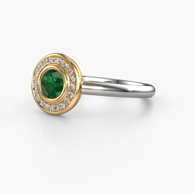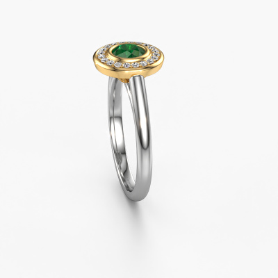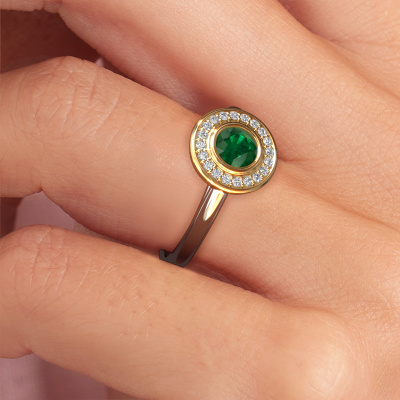 The ring shown above is called the Noud 1 RND. We call this type of ring a halo ring because it has one centre gemstone and a band that is also pave set with gemstones. The 14 Carat white gold promise ring is set with a round 4.7 mm emerald centre stone and the band is pave set with diamonds. What makes this traditional white gold halo ring special are the smaller sized stones embracing the centre stone. This gorgeous promise ring is called a halo ring because the smaller gemstones give the centre stone a halo of surrounding light. In order for the smaller stones to enhance the centre stone, they have to be placed so there is no interference of light. And that's when our expert goldsmiths come in. Each individual stone is carefully set in the ring by hand. During manufacturing, light fall is constantly monitored to make sure the special halo is still visible. In the end you get a unique promise ring, with a emerald of your choosing at its centre. You can imagine the effect of a ring of such significance when you give it to her on her special day to shine. By using a combination of the latest modern techniques, combined with ancient crafting, we can make all our promise ring in our own studio. Each jewel is made to order. This is advantageous because we can offer you a price you won't find anywhere else.Do you have a specific ring in mind? One you came across somewhere. Please feel free to tell us your wishes and we will turn your design into a unique promise ring. You can follow the development of your ring design because we use 3D drawings. This gives you a realistic preview of your design. We will gladly send you a non-binding offer, based on a fair price/ quality ratio. It will amaze you.To make it easier for you, we offer a 30 day return policy. Check our terms and conditions.