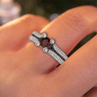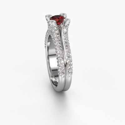 This 14 Carat white gold ring is called Stefanie 2 and is set with 5 mm garnet. Does your girlfriend fancy exclusive jewellery? Or would you like to show her that she deserves the finest jewellery? This white gold ring is pure craftsmanship, love and passion combined with the latest techniques coming together in perfect harmony. It requires a keen eye, patience and a skilful hand to mould this ring into perfection. Just the job for our expert goldsmith! The garnet set gemstones gives this white gold ring an extra glamorous appearance. Customize the style of the split band engagement ring to her liking with a wide variety of precious metals and gemstones which you select. That is how you create a unique ring for the most exclusive woman in your life! This jewel is made just for you by our master goldsmiths in our own studio.After receiving your order, our goldsmiths will passionately start the creative process of making your engagement ring in our own studio. Because we don't have a big stockpile, these costs will not be passed on to you. Our pricing is proof of that! We offer top quality jewels at lowest price, guaranteed.Different styles of new rings are made daily by our team. Perhaps you have found a pavé solitaire engagement ring somewhere. One you would like to give to your loved one. Please feel free to share your thoughts and design with our jewel designers. We would love to turn your design into a unique engagement ring. You can follow the development of your ring design because we use very detailed 3D drawings. On top of that, you can order a dummy of the design. A dummy is a plastic ring, which can be shaped according your ring design. You can try it on and check if the engagement ring is up to standard. We will gladly send you a non-binding offer, based on a fair price/ quality ratio. The offer will baffle you, considering the quality of the ring and gemstones.To make it easier for you, we offer a 30 day return policy. Check our terms and conditions.