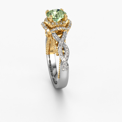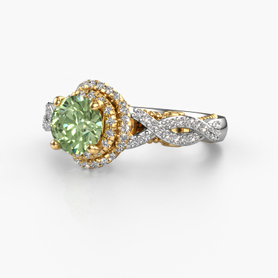 The ring shown above is called the Leora. We call this type of ring a halo ring because it has one centre gemstone and a band that is also pave set with gemstones. The 14 Carat white gold engagement ring is set with a round 6.5 mm green lab grown diamond centre stone and the band is pave set with lab-grown diamonds. What makes this vintage white gold halo ring special are the smaller sized stones embracing the centre stone. This gorgeous engagement ring is called a halo ring because the smaller gemstones give the centre stone a halo of surrounding light. In order for the smaller stones to enhance the centre stone, they have to be placed so there is no interference of light. And that's when our expert goldsmiths come in. Each individual stone is carefully set in the ring by hand. During manufacturing, light fall is constantly monitored to make sure the special halo is still visible. In the end you get a unique engagement ring, with a green lab grown diamond of your choosing at its centre. You can imagine the effect of a ring of such significance when you give it to her on her special day to shine. By using our modern techniques, we can design and customize the finest quality jewels with the utmost care for you. Our engagement rings are always priced 30 percent lower than other jewellers. We make engagement rings to order so we don't have to maintain a large stock. If you have a certain budget, we are more than happy to advice you accordingly.Our designers and goldsmiths work together each day, creating new jewels. Perhaps you have found a nice vintage engagement ring somewhere, which can be used to customize your unique ring. Please feel free to contact us. We will make you an offer, based on a fair price/ quality ratio, which will amaze you.To make it easier for you, we offer a 30 day return policy. Check our terms and conditions.