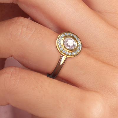 The ring shown above is called the Noud 1 RND. We call this type of ring a halo ring because it has one centre gemstone and a band that is also pave set with gemstones. The 14 Carat white gold promise ring is set with a round 4.7 mm morganite champagne centre stone and the band is pave set with diamonds. What makes this traditional white gold halo ring special are the smaller sized stones embracing the centre stone. This gorgeous promise ring is called a halo ring because the smaller gemstones give the centre stone a halo of surrounding light. In order for the smaller stones to enhance the centre stone, they have to be placed so there is no interference of light. And that's when our expert goldsmiths come in. Each individual stone is carefully set in the ring by hand. During manufacturing, light fall is constantly monitored to make sure the special halo is still visible. In the end you get a unique promise ring, with a morganite champagne of your choosing at its centre. You can imagine the effect of a ring of such significance when you give it to her on her special day to shine. By using a combination of the latest modern techniques, combined with ancient crafting, we can make all our promise ring in our own studio. Each jewel is made to order. This is advantageous because we can offer you a price you won't find anywhere else.Do you have a specific ring in mind? One you came across somewhere. Please feel free to tell us your wishes and we will turn your design into a unique promise ring. You can follow the development of your ring design because we use 3D drawings. This gives you a realistic preview of your design. We will gladly send you a non-binding offer, based on a fair price/ quality ratio. It will amaze you.To make it easier for you, we offer a 30 day return policy. Check our terms and conditions.