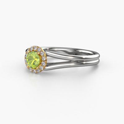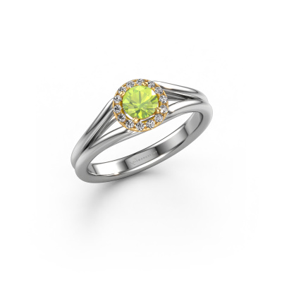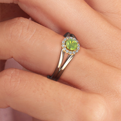 The ring shown above is called the Verla rnd 1. We call this type of ring a halo ring because it has one centre gemstone and a band that is also pave set with gemstones. The 14 Carat white gold engagement ring is set with a round 4.7 mm peridot centre stone and the band is pave set with diamonds. What makes this classic white gold halo ring special are the smaller sized stones embracing the centre stone. This gorgeous engagement ring is called a halo ring because the smaller gemstones give the centre stone a halo of surrounding light. In order for the smaller stones to enhance the centre stone, they have to be placed so there is no interference of light. And that's when our expert goldsmiths come in. Each individual stone is carefully set in the ring by hand. During manufacturing, light fall is constantly monitored to make sure the special halo is still visible. In the end you get a unique engagement ring, with a peridot of your choosing at its centre. You can imagine the effect of a ring of such significance when you give it to her on her special day to shine. By using a combination of the latest modern techniques, combined with ancient crafting, we can make all our engagement rings in our own studio. Each jewel is made to order. This is advantageous because we can offer you a price you won't find anywhere else.Our team adds new designs to our online collection daily. Our designers and goldsmiths work together in creating the best design. We strive to offer a diverse collection of jewels. Perhaps you have a specific jewel design in mind. One you came across somewhere. Please contact us for a free consultation. We will make you an offer, based on a fair price/ quality ratio, that will baffle you.To make it easier for you, we offer a 30 day return policy. Check our terms and conditions.