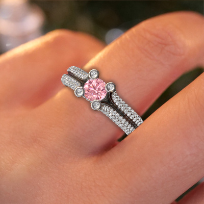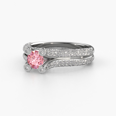 This 14 Carat white gold ring is called Stefanie 2 and is set with 5 mm pink lab grown diamond. Does your girlfriend fancy exclusive jewellery? Or would you like to show her that she deserves the finest jewellery? This white gold ring is pure craftsmanship, love and passion combined with the latest techniques coming together in perfect harmony. It requires a keen eye, patience and a skilful hand to mould this ring into perfection. Just the job for our expert goldsmith! The pink lab grown diamonds set gemstones gives this white gold ring an extra glamorous appearance. Customize the style of the split band engagement ring to her liking with a wide variety of precious metals and gemstones which you select. That is how you create a unique ring for the most exclusive woman in your life! This jewel is made just for you by our master goldsmiths in our own studio.After receiving your order, our goldsmiths will passionately start the creative process of making your engagement ring in our own studio. Because we don't have a big stockpile, these costs will not be passed on to you. Our pricing is proof of that! We offer top quality jewels at lowest price, guaranteed.Different styles of new rings are made daily by our team. Perhaps you have found a pavé solitaire engagement ring somewhere. One you would like to give to your loved one. Please feel free to share your thoughts and design with our jewel designers. We would love to turn your design into a unique engagement ring. You can follow the development of your ring design because we use very detailed 3D drawings. On top of that, you can order a dummy of the design. A dummy is a plastic ring, which can be shaped according your ring design. You can try it on and check if the engagement ring is up to standard. We will gladly send you a non-binding offer, based on a fair price/ quality ratio. The offer will baffle you, considering the quality of the ring and gemstones.To make it easier for you, we offer a 30 day return policy. Check our terms and conditions.
