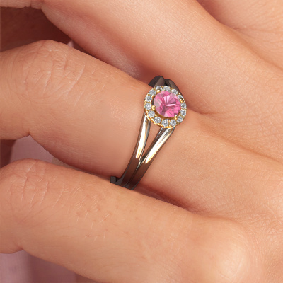 The ring shown above is called the Verla rnd 1. We call this type of ring a halo ring because it has one centre gemstone and a band that is also pave set with gemstones. The 14 Carat white gold engagement ring is set with a round 4.7 mm pink sapphire centre stone and the band is pave set with diamonds. What makes this classic white gold halo ring special are the smaller sized stones embracing the centre stone. This gorgeous engagement ring is called a halo ring because the smaller gemstones give the centre stone a halo of surrounding light. In order for the smaller stones to enhance the centre stone, they have to be placed so there is no interference of light. And that's when our expert goldsmiths come in. Each individual stone is carefully set in the ring by hand. During manufacturing, light fall is constantly monitored to make sure the special halo is still visible. In the end you get a unique engagement ring, with a pink sapphire of your choosing at its centre. You can imagine the effect of a ring of such significance when you give it to her on her special day to shine. By using a combination of the latest modern techniques, combined with ancient crafting, we can make all our engagement rings in our own studio. Each jewel is made to order. This is advantageous because we can offer you a price you won't find anywhere else.Our team adds new designs to our online collection daily. Our designers and goldsmiths work together in creating the best design. We strive to offer a diverse collection of jewels. Perhaps you have a specific jewel design in mind. One you came across somewhere. Please contact us for a free consultation. We will make you an offer, based on a fair price/ quality ratio, that will baffle you.To make it easier for you, we offer a 30 day return policy. Check our terms and conditions.