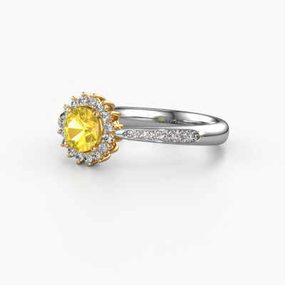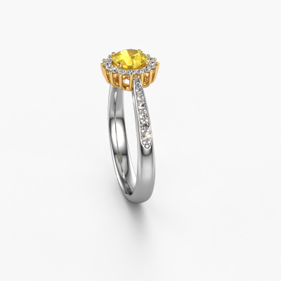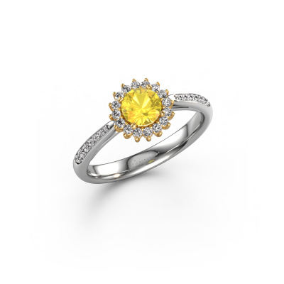 The ring shown above is called the Tilly RND 2. We call this type of ring a cluster ring, the centre gemstone is surrounded by smaller sized stones. This 14 Carat white gold version is set with a 5 mm round yellow sapphire centre stone, embraced by smaller diamonds. If you look at this white gold cluster engagement ring, you might get the impression that its smaller sized stones collide with the bigger yellow sapphire, so it is shaped like a flower. Therefore this engagement ring is also known as the flower ring. Our artisan goldsmiths get the job done. Each individual stone is carefully set by hand. During manufacturing, light fall is constantly monitored to make sure the special cluster effect is still visible. In the end you get the perfect engagement ring with a radiant yellow sapphire gemstone centrepiece. You can imagine the effect of a ring of such significance when you give tot the love of your life on her special day to shine. After receiving your order, our goldsmiths will start the creative process of making your Tilly RND 2 engagement ring. We don't keep stock. This is advantageous because these costs will not be passed on to you. Therefore, we can offer jewellery at exceptionally low prices.Our team adds new designs to our online collection daily. Our designers and goldsmiths work together in creating the best design. We strive to offer a diverse collection of jewels. Perhaps you have a specific jewel design in mind. One you came across somewhere. Please contact us for a free consultation. We will make you an offer, based on a fair price/ quality ratio, that will baffle you.To make it easier for you, we offer a 30 day return policy. Check our terms and conditions.