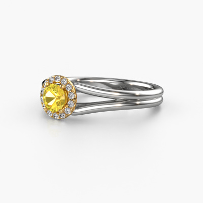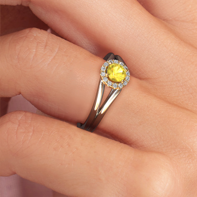 The ring shown above is called the Verla rnd 1. We call this type of ring a halo ring because it has one centre gemstone and a band that is also pave set with gemstones. The 14 Carat white gold engagement ring is set with a round 4.7 mm yellow sapphire centre stone and the band is pave set with diamonds. What makes this classic white gold halo ring special are the smaller sized stones embracing the centre stone. This gorgeous engagement ring is called a halo ring because the smaller gemstones give the centre stone a halo of surrounding light. In order for the smaller stones to enhance the centre stone, they have to be placed so there is no interference of light. And that's when our expert goldsmiths come in. Each individual stone is carefully set in the ring by hand. During manufacturing, light fall is constantly monitored to make sure the special halo is still visible. In the end you get a unique engagement ring, with a yellow sapphire of your choosing at its centre. You can imagine the effect of a ring of such significance when you give it to her on her special day to shine. By using a combination of the latest modern techniques, combined with ancient crafting, we can make all our engagement rings in our own studio. Each jewel is made to order. This is advantageous because we can offer you a price you won't find anywhere else.Our team adds new designs to our online collection daily. Our designers and goldsmiths work together in creating the best design. We strive to offer a diverse collection of jewels. Perhaps you have a specific jewel design in mind. One you came across somewhere. Please contact us for a free consultation. We will make you an offer, based on a fair price/ quality ratio, that will baffle you.To make it easier for you, we offer a 30 day return policy. Check our terms and conditions.