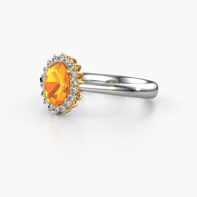 The ring shown above is called the Tilly ovl 1. We call this type of ring a cluster ring, the centre gemstone is surrounded by smaller sized stones. This 14 Carat white gold version is set with a 7x5 mm oval citrin centre stone, embraced by smaller lab-grown diamonds. The classic white gold cluster engagement ring stands out because of its shape. Together, the smaller and bigger sized citrin gemstones form a flower and they appear to collide into one big sparkling gem. This classic engagement ring is also known as the flower ring. Our expert Goldsmiths make sure the smaller lab-grown diamonds stones are set identically so there is no light interference in the citrin but unity instead. With perfect precision and a skilful hand each citrin is set in the ring. During manufacturing, it is constantly monitored to make sure light reflects flawlessly. This results in a unique engagement ring, with a radiant citrin at its centre. A lovely, meaningful gift to bestow upon the love of your life. By using a combination of the latest modern techniques, combined with ancient crafting, we can make all our engagement rings in our own studio. Each jewel is made to order. This is advantageous because we can offer you a price you won't find anywhere else.Do you have a specific ring in mind? One you came across somewhere. Please feel free to tell us your wishes and we will turn your design into a unique engagement ring. You can follow the development of your ring design because we use 3D drawings. This gives you a realistic preview of your design. We will gladly send you a non-binding offer, based on a fair price/ quality ratio. It will amaze you.To make it easier for you, we offer a 30 day return policy. Check our terms and conditions.